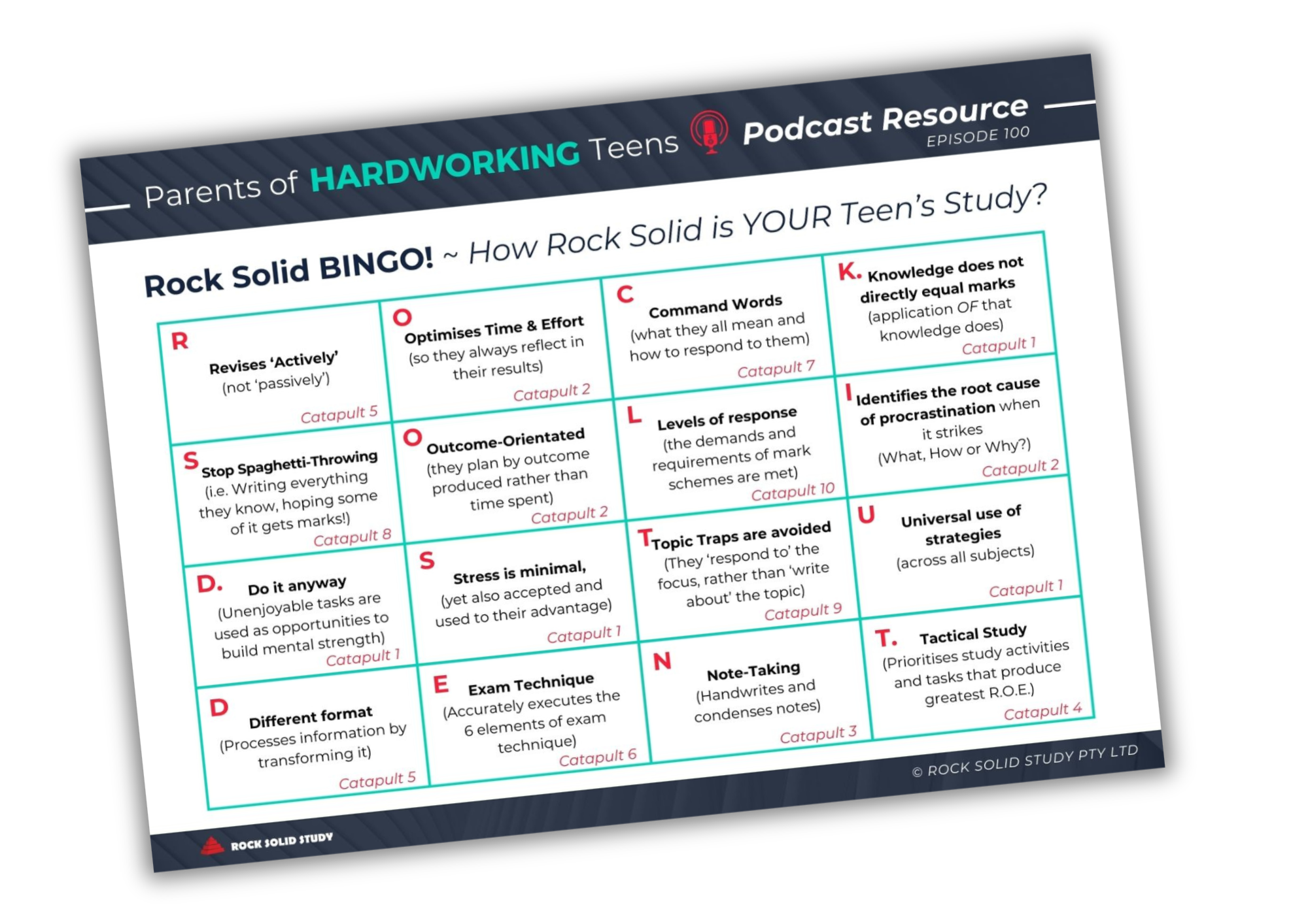 So many students are using passive revision techniques like re-writing notes, reading over information, or making copious palm cards, rather than active revision techniques, where they actually process the information from one format to another. If your teen is revising Actively for every test and exam, then check this box off on your card. And if not, or if they need a recap, then full training on Revision that Actually Works is in Catapult 5 of the 10WGT.