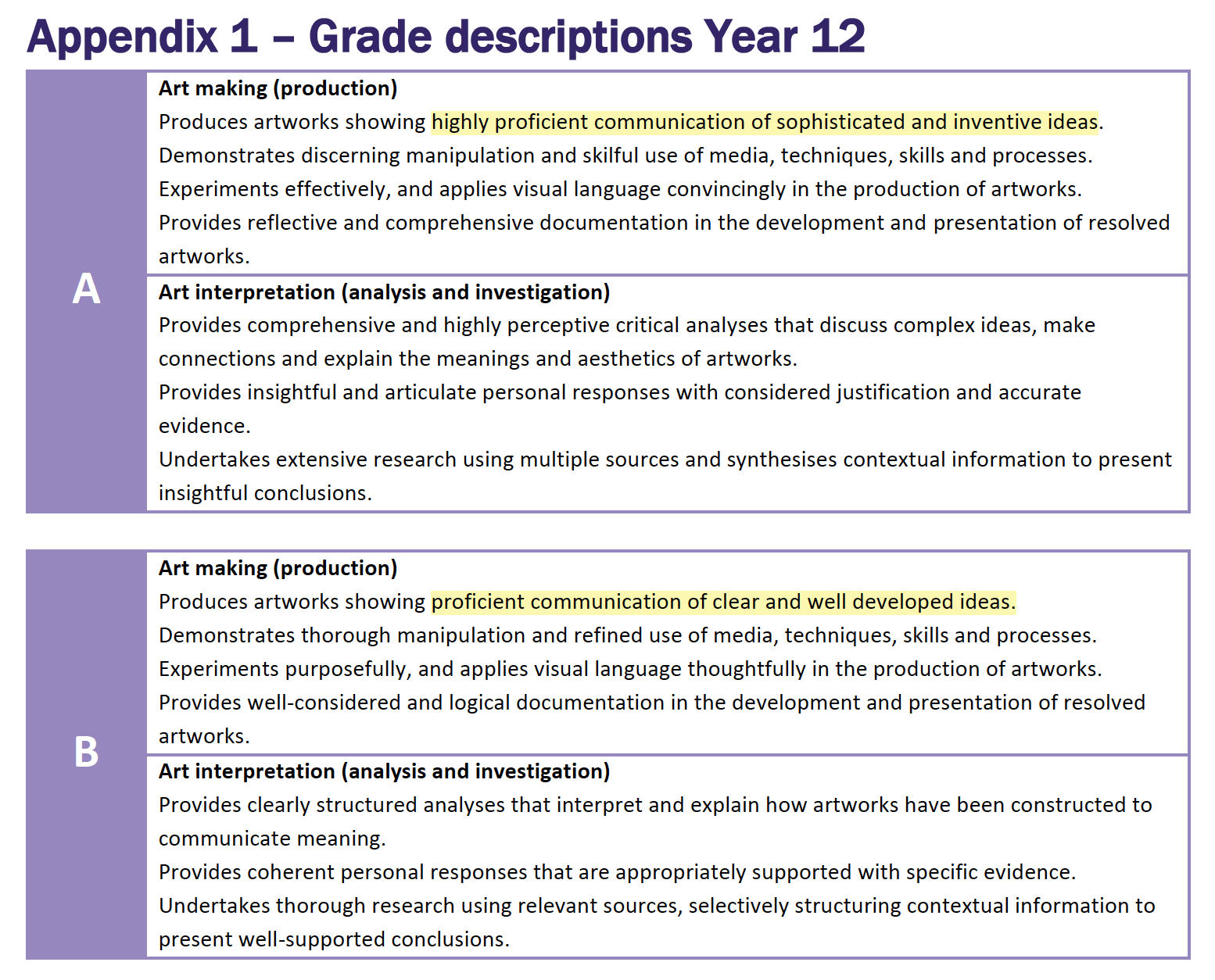 Produces artworks showing highly proficient communication of sophisticated and inventive ideas. For an A. And Produces artworks showing proficient communication of clear and well developed ideas For a B.